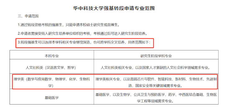 华科大对符合培养要求的强基计划学生实行本研衔接培养。进入研究生阶段后,学生主要在强基计划所在基础学科专业进行培养,部分学生也可根据培养方案在高端芯片与软件、智能科技、新材料、先进制造和国家安全等关键领域以及国家人才紧缺的人文社会科学领域进行学科交叉培养。