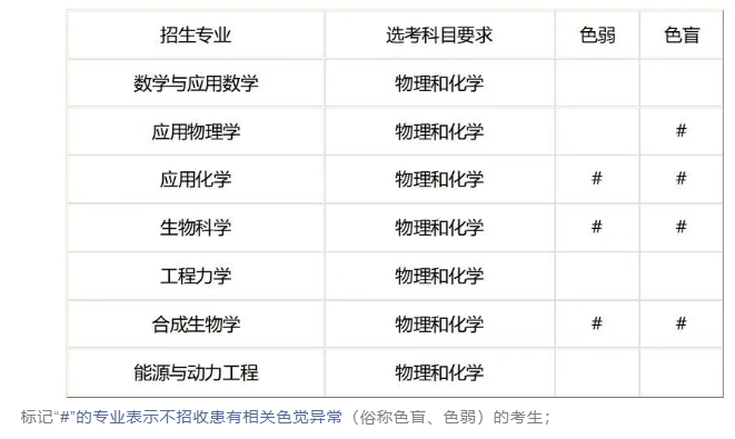 招生专业包括数学与应用数学、应用物理学、应用化学、生物科学、工程力学、合成生物学、能源与动力工程。所有招生专业在非高考改革省份招收理科考生,在高考改革省份选考科目要求见下表: