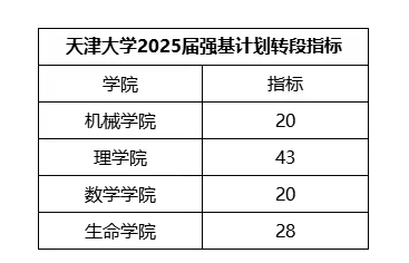2020年天津大学首届强基计划招生共150人,硕士+直博转段人数104人,转段率为69.3%。数学学院强基生中有1人转段到智能医学工程专业,4人转段到计算机科学与技术专业。生物学专业强基生中,10人转段到生物学硕士,10人直博生物学专业博士,无人转段到其他专业。工程力学专业强基生中,10人直博,5人直博到机械专业,18人转段硕士,其中14人转段本专业。