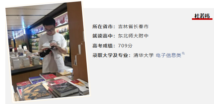 我是来自吉林省长春市东北师大附中2025届的杜若祎,高考成绩709分,全省第5名,长春市应届学生第1名,以裸分成绩709分成功上岸清华大学电子信息。