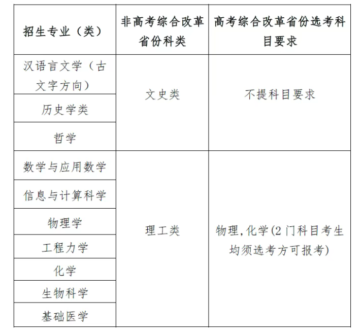 四川大学强基计划招生专业为汉语言文学(古文字方向)、历史学类(含历史学、考古学、文物与博物馆学专业)、哲学、数学与应用数学、信息与计算科学、物理学、工程力学、化学、生物科学、基础医学。以下为各专业选科要求↓