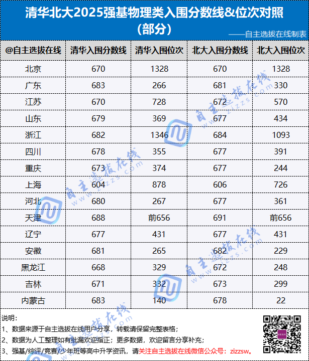 从各省清华北大强基入围分数线来看两校差距不大,分差基本维持在0~5分之间。其中内蒙古清华比北大高5分,分差最高,浙江北大比清华位次高253位,位次差最高。