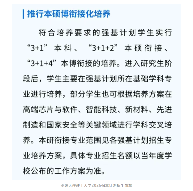 如大连理工大学,强基计划分别制定“3+1”本科、“3+1+2”本硕衔接、“3+1+4”本博衔接的培养方案,考生可以根据自己的规划选择直接毕业、还是本硕连读、或者本博连读。