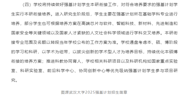 如武汉大学,进入研究生阶段后,学生主要在强基计划所在基础学科专业进行培养,部分学生也可根据培养方案在高端芯片与软件、智能科技、新材料、先进制造和国家安全等关键领域以及国家人才紧缺的人文社会科学领域进行学科交叉培养。