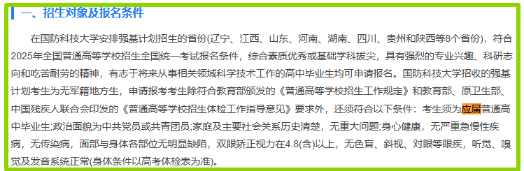 但是需要注意的是,在2025年国防科技大学强基计划报名条件中,明确了报考的考生除过符合相关规定外,还需要为应届普通高中毕业生。其他学校没有明确关于应届生的限制。