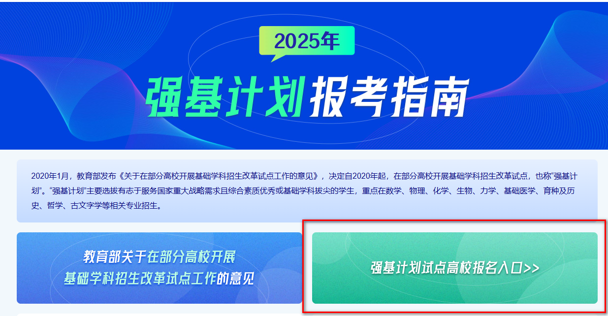 强基计划统一在阳光高考特殊招生报名平台进行报名,2025年强基计划报名入口:https://gaokao.chsi.com.cn/gkzt/jcxkzs,也可在招生简章内查看报名地址。