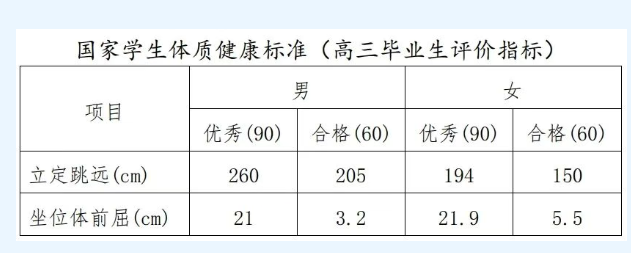 项目为坐位体前屈和立定跳远两项,执行《国家学生体质健康标准》(高三毕业生评价指标)(详见附件)。体育测试结果不计入综合成绩,合格即可,但凡有一项测试不合格者即失去参加综合能力测试资格。因残疾或重疾等身体原因不能参加体育测试的考生,可凭相关证明免除体育测试,其余考生均需参加两项测试。考生因临时生病不能参加体育测试,可凭二级甲等以上医院病历办理缓测手续,后期按规定补测,补测不合格者取消入学资格。