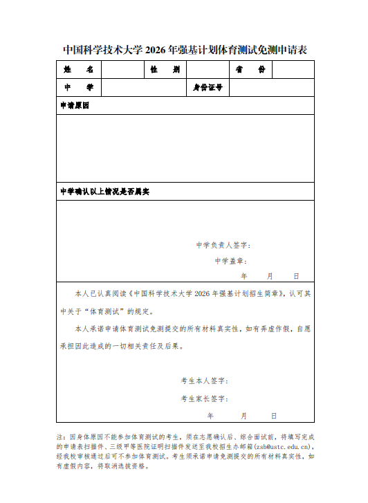 因身体原因不能参加体育测试的考生,须在志愿确认后、综合面试前,填写《中国科学技术大学2026年强基计划体育测试免测申请表》(见附件),将申请表扫描件、三级甲等医院证明扫描件发送至我校招生办邮箱(zsb@ustc.edu.cn),经我校审核通过后可不参加体育测试。考生须承诺申请免测提交的所有材料真实,如有虚假内容,将取消选拔资格。