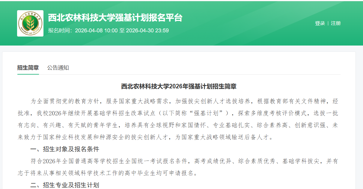 4月8日至4月30日前,考生可登录西北农林科技大学强基计划报名平台(https://bm.chsi.com.cn/jcxkzs/sch/10712),按要求准确、完整地完成网上报名。考生不能兼报其他高校强基计划。北京高考在线团队特意整理了西北农林科技大学2026强基计划报名入口,具体信息如下: