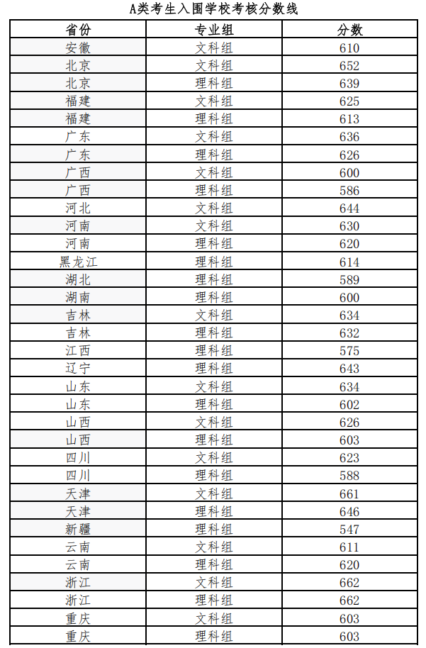 1、对于A类考生(综合素质优秀、成绩优异),依据高考成绩(不含任何政策加分,下同),按分省分专业组计划数5倍的比例确定入围学校考核考生名单(末位同分均可入围),且高考成绩须达到生源所在省份同科类特招线/一本线上一定分值: