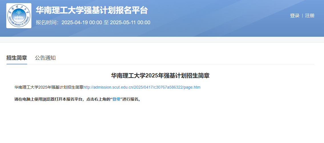 考生可登录华南理工大学强基计划报名平台,按要求准确、完整地完成网上预报名。