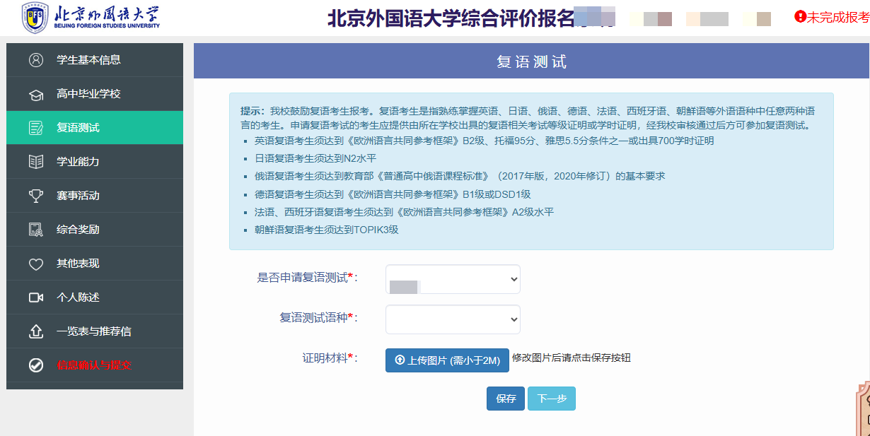 第三步,选择是否参加复语测试并上传材料(复语相关考试等级证明或学时证明)