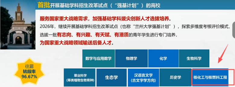 这是兰大首次将工科专业纳入强基计划招生范畴。符合当前强基计划向关键领域工科拓展的趋势。为对核能、国防科技等领域有志向的考生提供了一条全新的培养路径。感兴趣的2026届考生可以重点关注!