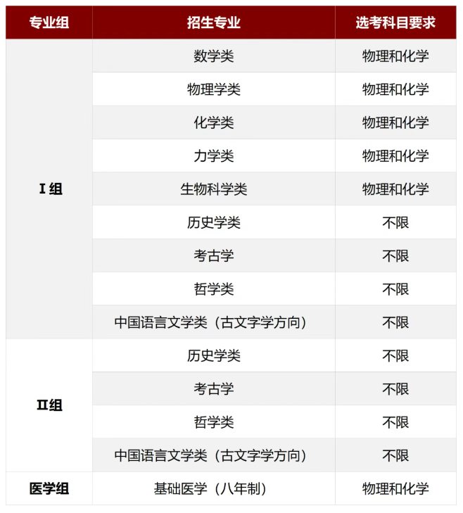 学科基础素质考核:通过笔试着重考察学生学科基础能力,Ⅰ组和医学组笔试科目为:数学、物理、化学,Ⅱ组笔试科目为:语文、英语、历史。