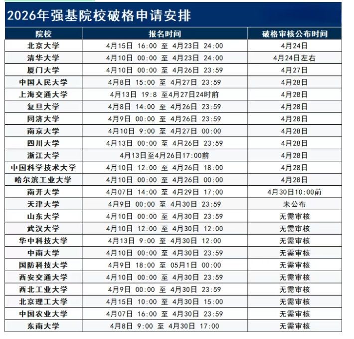 参考2026年各高校强基破格申请及审核时间,未通过强基破格审核的考生,还有机会继续申请其他学校的破格生。或选择其他无须破格审核的高校,无论哪种选择,报名时间都很紧张,建议考生家长尽快准备报名材料进行报考。
